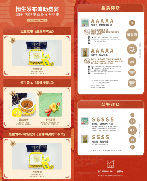 说起五湖四海的精品年货,就不能不提1月8日那场舌尖上的年味之旅,专业食品评价机构恒生发布,集结阿里数字乡村和天猫超级原产地等渠道、地方特色食品企业和实力消费品牌选送的预制菜肴和主食类产品,在京城汇贤府餐厅举办年货节主题流动盛宴,来自阿里数字乡村合作县域的6款特色产品有幸入围,有黄山的菌菇干货礼盒、广平的蒲公英手抓饼、铁力的煎饼与香米、江阴的刀鱼馄饨、敖汉的小米、鸡泽的辣椒,在道道精致的饕餮美食中,最后为我们精选出《最想购买的年夜饭菜》品质5A+品鉴5S级珍馐美味——泰渔记·刀鱼馄饨。