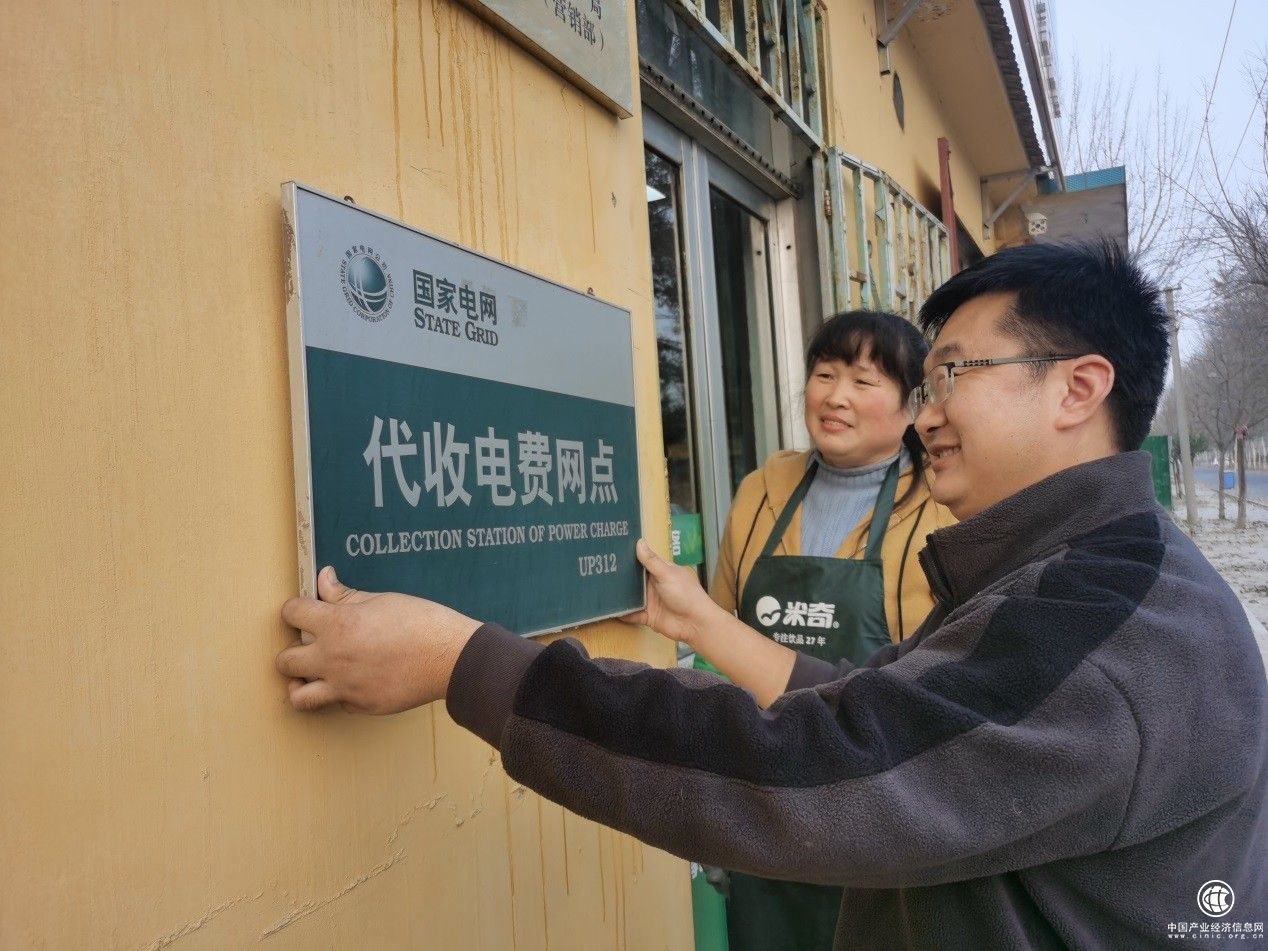 (图为客户经理帮助老郭悬挂代收电费网点的牌子)