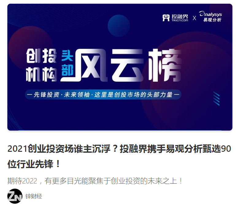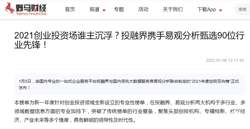 时值2021年与2022年交汇之际,各行各业都做出了对于2021年的总结回顾。在创投市场,国内专业一站式创业服务平台投融界则在近日携手知名大数据服务商易观,借助双方在数据信息服务领域的专业积累,发布了“2021年度创投双向榜”,得到国内众多投资机构及创业者的关注,也受到凤凰网、环球网、锌财经、野马财经等众多权威媒体的报道及转载。