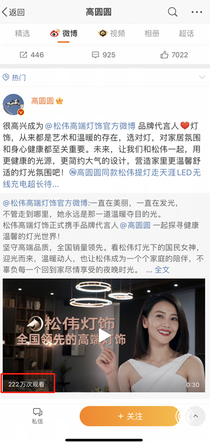 据悉,高圆圆代言微博发布5小时后,实时播放量突破200万次!