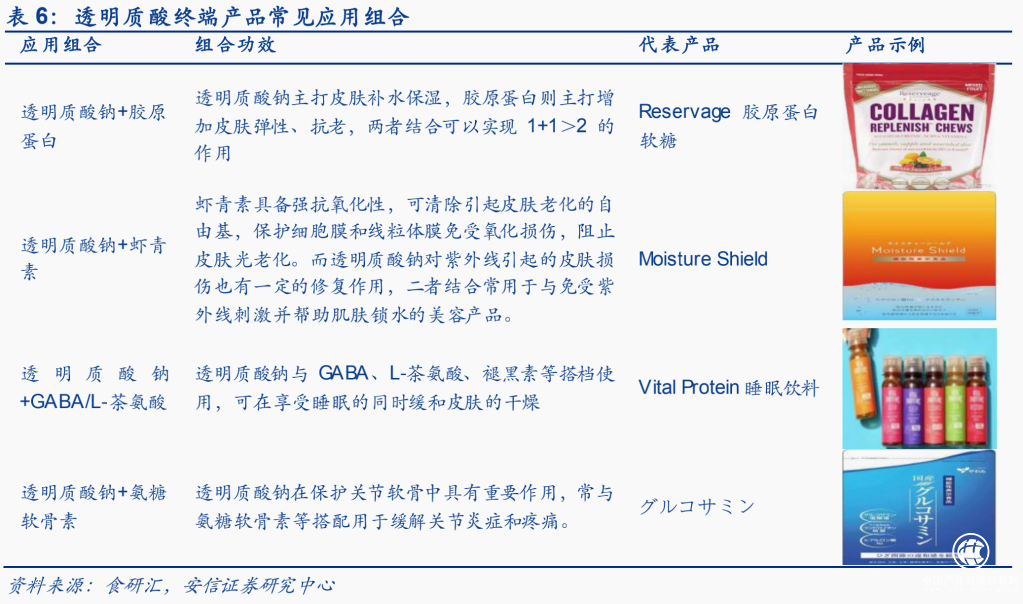 安信证券研究报告提出:玻尿酸未来有望作为食品原料搭配胶原蛋白、虾青素等成分,结合消费者喜好推出不同组合或剂型,应用于下游乳及乳制品、饮料、巧克力制品、糖果及其他功能性食品。