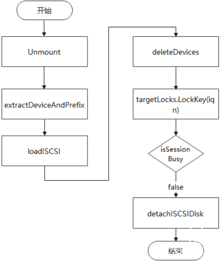 pod销毁的时候,会由kubelet完成volume的umount&detach操作,核心代码位于kubernetes/pkg/volume/iscsi目录下,主要完成umount node上的挂载信息,之后根据globalPDPath目录下iscsi.json元数据信息来完成TearDownDevice断开device,之后清理掉globalPDPath。