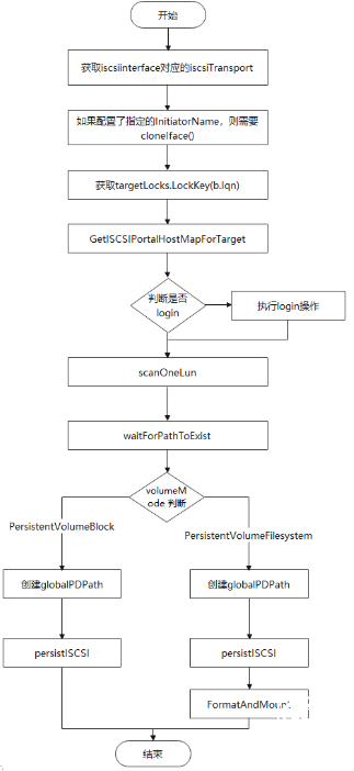 pod调度到某个node上,之后由kubelet中的volumemanager完成对于volume attach&mount操作,核心代码位于kubernetes/pkg/volume/iscsi目录下,在volume挂载的过程中,会首先调用WaitForAttach()完成挂载流程,SetUpDevice()挂载到某个容器所对应的目录。iscsiAttacher.WaitForAttach()流程如图所示: