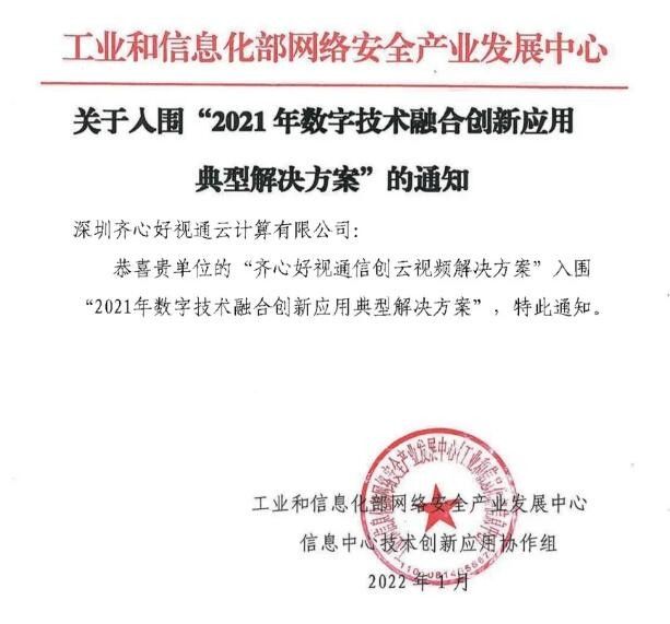 好视通成功入围工业和信息化部网络安全产业发展中心评选出的『2021年数字技术融合创新应用典型解决方案』,充分彰显好视通在融合创新、技术驱动、自主可控、信创成果等方面获得国家权威部门认可!