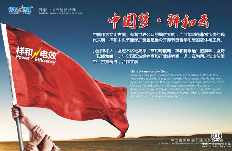 “中国梦,祥和云”,把祥和人致力于为实现中华民族的伟大复兴的中国梦追求,力争用祥和中央节能保护装置这一祥和首创的中央节能保护设备,占领中国节能节电市场的1/6,致力于节能这一继电能、石油、煤炭、天然气之后的第五大资源开发,为国家再造一个绿色三峡电站,为中国碳中和伟大事业贡献祥和力量。
