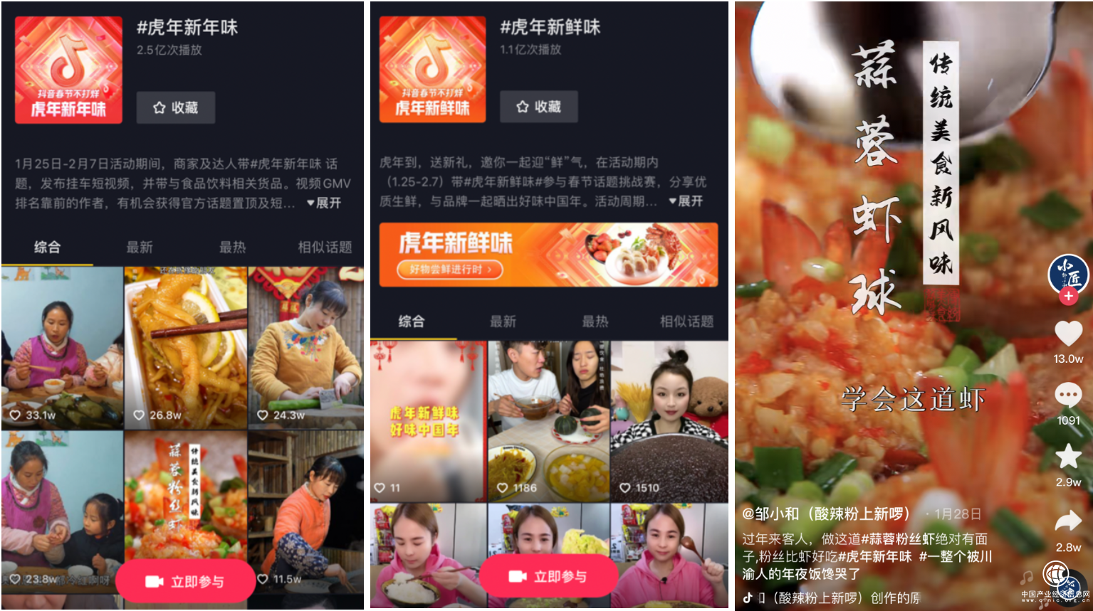 年货经济催热“吃”需求,春节味道成“流量密码”。活动期间,#虎年新年味 播放量高达2.5亿次,各地特色年货与菜品做法成热点话题;#虎年新鲜味 播放量达味1.1亿次,让更多优质生鲜货品进入了年夜饭的饭桌。