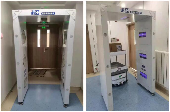 据介绍,自从应用了机器人为主的防疫物流解决方案后,崇礼院区运送洁净物资到隔离病区时,再也无需医务人员进入感染疾病楼。在接收到医护人员给出的指令后,机器人将物资从一楼运输到三楼,途中将自行经过采用广明源222nm准分子灯管的“光疫苗门”,通过222nm波长光进行全方位消毒后,机体表面的冠状病毒被破坏,失去复制能力,从而起到消杀作用。
