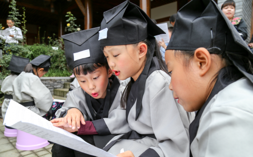蝉鸣鸟叫间,沿山间小路拾级而上,登顶方至书院。书院中,6个小学和幼小衔接学段的班级同时开展教学,学生们在夯实语数外等课程基础的同时,更会系统学习书院开设的国学课程。