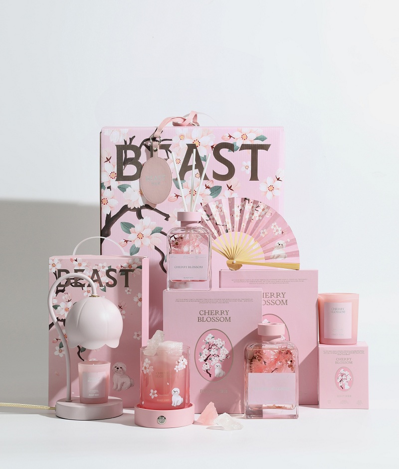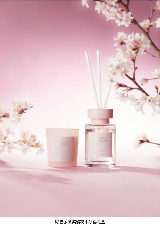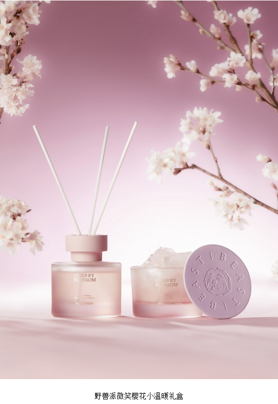 2022年初春,艺术生活方式品牌野兽派正式推出春季限定 “微笑樱花”系列。该系列集香氛/花艺/家居为一体,延续嗅觉与视觉双重美学概念,并创新推出扩香晶石氛围灯,与可爱小狗一起打造粉嫩春天。