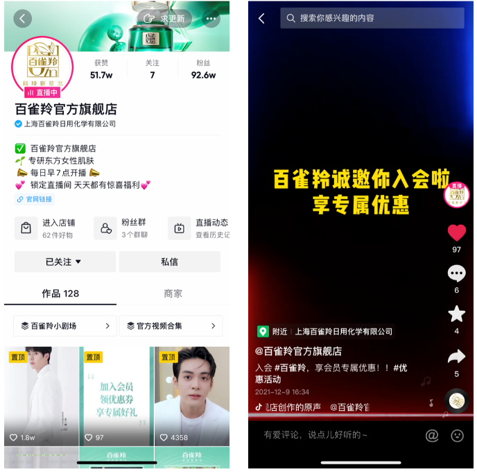 2021年3月,国潮代表百雀羚启动抖音电商品牌旗舰店直播,将百雀羚护肤之道分享给用户。运营模式为服务商合作非自营,快速度过冷启动期并且在双十一当日突破500wGMV。