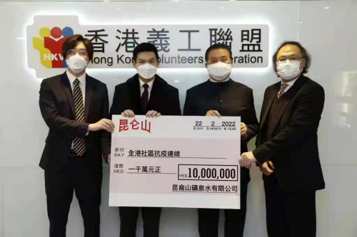 昆仑山矿泉水有限公司积极响应号召,拨捐3000万港币以支援全城防疫抗疫工作。昆仑山矿泉水有限公司副总裁陈文钜等公司领导出席捐赠仪式,香港特首办主任陈国基、全港社区抗疫连线总召集人陈振彬等分别代表特区政府、相应机构接收捐赠,共同传递与全港市民携手同心、打赢抗疫战的必胜信念。