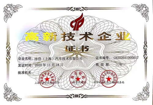 自2020年以来,沛岱连续两年获得ISO 9001:2015质量管理体系认证证书;2021年,沛岱汽车获得由上海市科学技术委员会、上海市财政局、国家税务总局上海市税务局联合颁发的高新技术企业证书。
