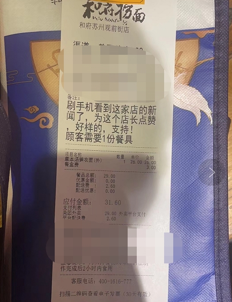 2月22日下午,观前街店来了份特别的外卖订单。订单备注上写着:“刷手机看到这家店的新闻了,为这个店长点赞,好样的,支持!”