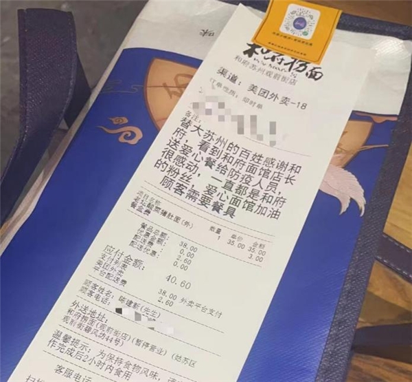 “您好,一名平平无奇的苏州人,感谢你为医务工作者奉献的爱心,这份面,就算是我力所能及的一点爱心吧!”