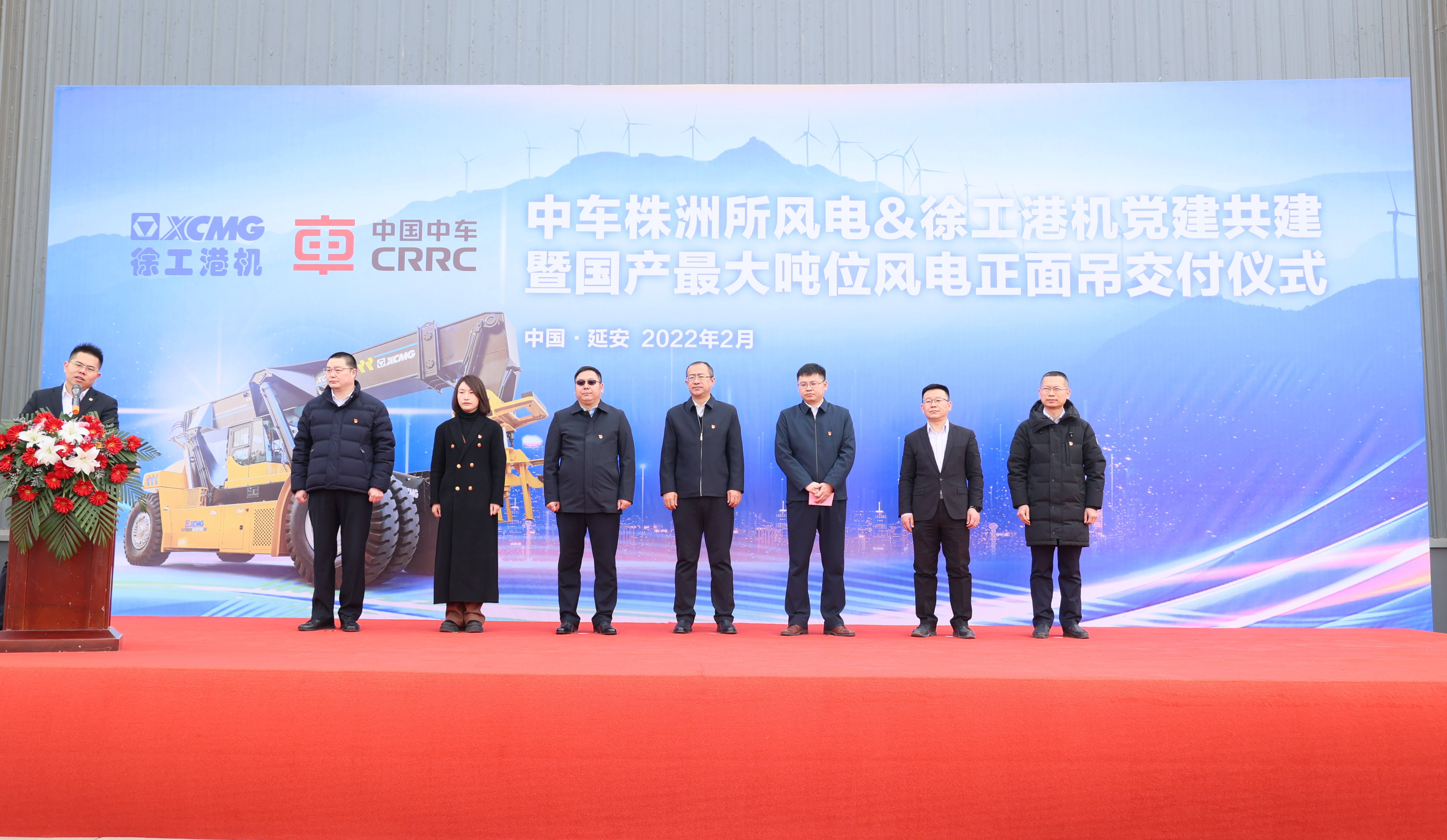 在经过前期研发合作后,2月28日,中车株洲所风电&徐工港机党建共建暨国产最大吨位风电正面吊交付仪式在陕西延安举行。延安市高新区党工委委员、管委会副主任丁许军,中车株洲所风电副总经理、党委副书记、纪委书记吴昌云,徐工港机副总经理、党委副书记陈相奇等出席仪式,与现场嘉宾、用户代表、媒体共同见证这一里程碑性时刻。