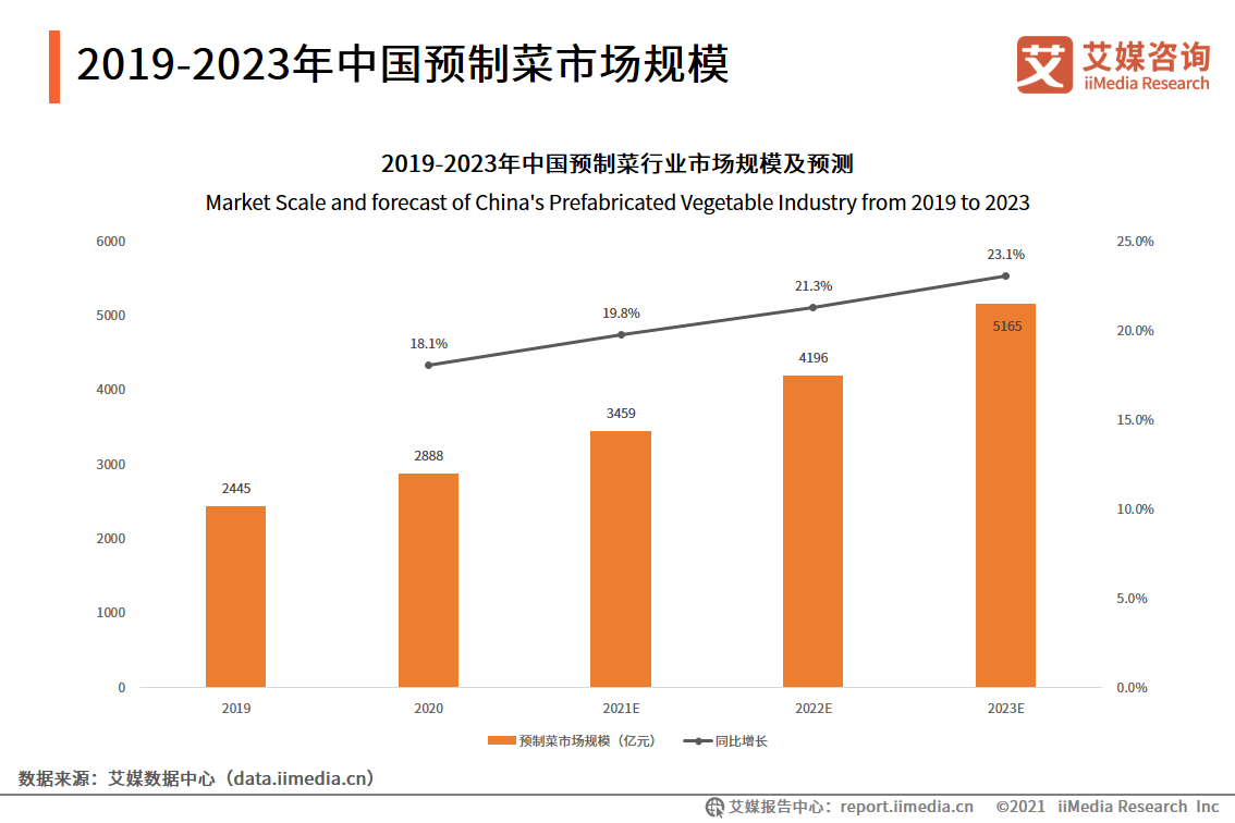 艾媒咨询数据显示,2021年中国预制菜市场规模预估为3459亿元,预制菜在中国属于刚起步阶段,随着消费升级以及冷链物流布局,预制菜市场之后将以20%的增长率逐年上升,迎来高速发展期,2023年中国预制菜市场规模约为5165亿元。