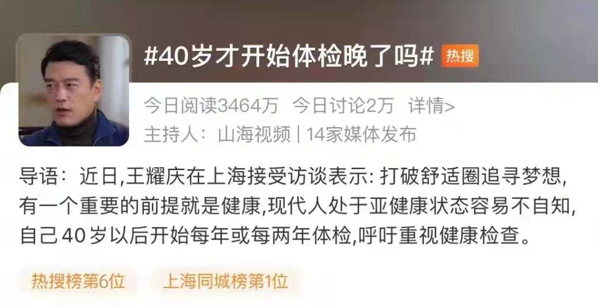 热搜话题下,是一则演员王耀庆接受采访的视频。王耀庆在采访中坦言,现如今的生活环境、饮食结构等都发生了巨大的改变,很多时候我们并不知道自身已经处于一种亚健康的状态。也正因如此,王耀庆从40岁开始养成了固定体检的习惯。