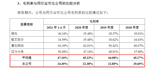 另一方面,歌尔微毛利率水平也显著低于可比同行。招股书(申报稿)显示,2018年、2019年、2020年和2021年1~6月,歌尔微毛利率分别为29.69%、22.85%、22.38%和24.30%,而楼氏、敏芯股份、睿创微纳、四方光电这些可比同行平均值分别为45.27%、44.08%、45.23%和47.10%。2018年,歌尔微与可比同行平均值相差约十六个百分点,而2021年1~6月,差距则拉大到约二十三个百分点,即毛利率差距越来越大。