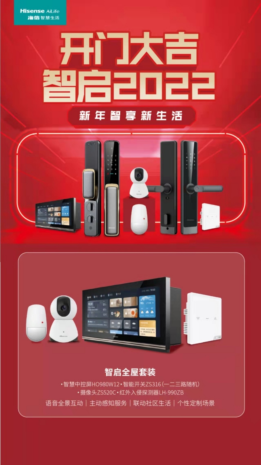 据了解,“开门大吉 智启2022”活动是海信全品类面向终端消费者的新年首销举措,海信智慧生再次释放了其智能家居产品强大的实力,推出了智能门锁系列产品及智启全屋套餐。其中,智启全屋套餐是以智能中控屏HO980W12为核心,搭配各类智能控制终端的家居类产品套装,为用户快速体验家庭智能化提供了可能。