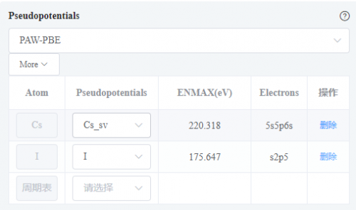 针对赝势及其内部参数获取繁琐的问题,MatCloud+将全种类赝势整合了到了每个组件中,仅需点选想要选择的赝势种类,就可实现为每个元素自动分配此类型的赝势,并结合元素和赝势种类自动给出推荐的截断能(见图4)。
