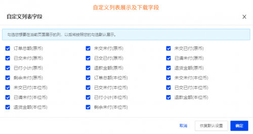 如不同的采购主体,输出的采购资金计划不一样,可在【统计-采购资金看板】左上角进行币种切换,数据支持USD、CNY和本位币等币种切换;同时,可以通过定义当期时间来查看和统计超期未付、预计交期未付的采购订单,制定付款资金计划;还可以自定义列表字段进行数据查看及下载,快速输出采购资金计划,满足卖家不同业务场景的数据需求。