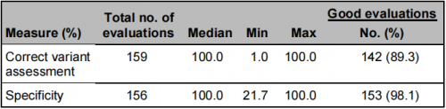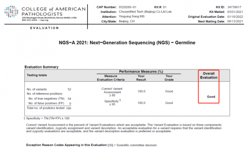 本次CAP NGS-A 能力评估是由CAP用于评估全球基因检测实验室使用NGS方法检测胚系变异能力的项目,在灵敏度与特异性方面考察对不同基因不同位置的点突变、插入/缺失等突变类型的检测和分析能力。考核范围包含ALK, BRAF, EGFR, ERCC2, KRAS, MET, RET, POLE, TP53等常见的肿瘤相关基因位点。通过核对,求臻医学检测结果与CAP官方标准结果完美一致,以敏感性和特异性100%,评级为“Good”的满分的成绩通过本次能力验证。