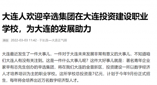 知名自媒体人于长连—大连正气哥,发表了一篇《大连人欢迎辛选集团在大连投资建设职业学校,为大连的发展助力》的文章,点赞辛选集团在大连培养数字经济人才的举措。