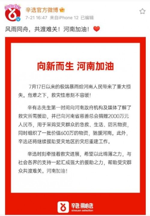 2021年5月,云南漾濞发生强震,辛选紧急采购近500万元的救灾物资驰援灾区,后期再向漾濞捐赠260万,助力震后学校重建;7月,河南发生重大雨灾,辛有志捐赠2000万元资金和600万元物资驰援灾区;10月,山西暴雨引发严重灾情,辛有志捐款500万驰援山西;11月,辛有志捐赠400余万元疫情防控和生活物资,全力支援黑龙江省疫情防控工作。