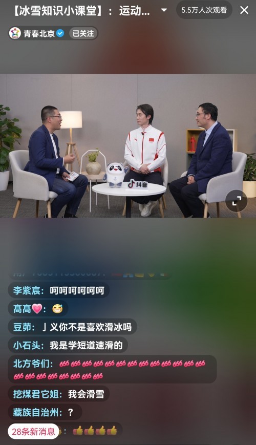 举世瞩目的北京冰雪赛事,掀起了大众参与冰雪运动、学习冰雪运动知识的热潮。3月3日晚6点,北京团市委在抖音账号“青春北京”开播“冰雪知识小课堂”。中国花样滑冰世界冠军佟健,中国人民大学附属中学教师李永乐两位嘉宾受邀亮相。他们与抖音创作人吕晓彤一道,带领网友在线学习冰雪运动小知识。