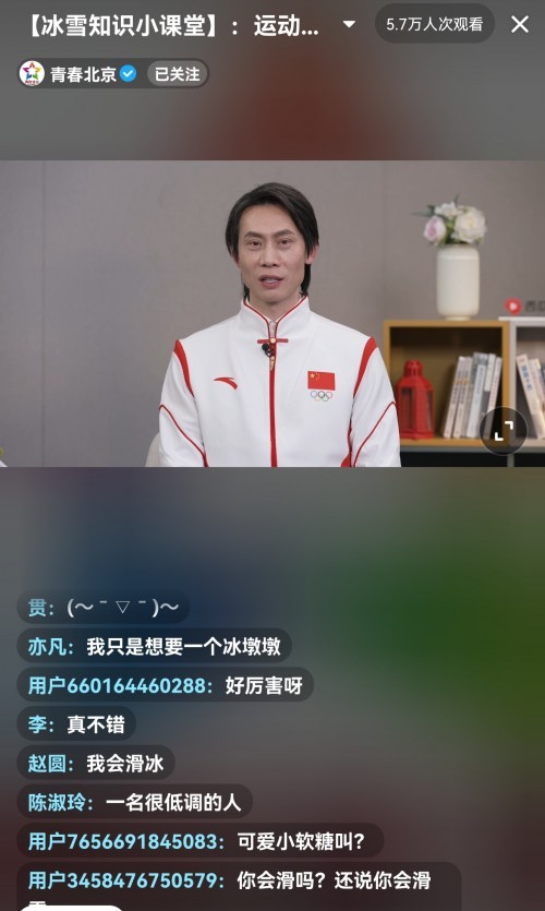 作为当晚直播的主要嘉宾,佟健是专业花样滑冰运动员,李永乐是高中物理老师。直播中,佟健从运动专业和运动心理等角度出发,而李永乐从则从物理知识为出发点,共同为大家奉献了一堂别开生面的冰雪知识课。据悉,此次直播在“青春北京”抖音直播间累计观看人次超5.9万。