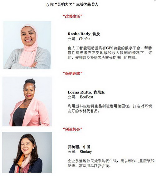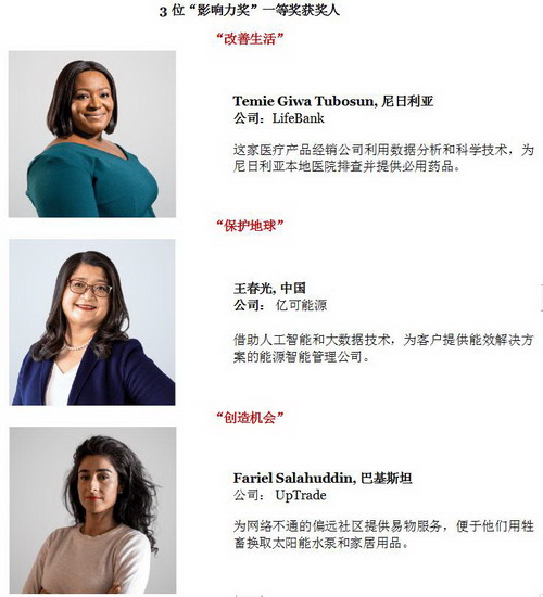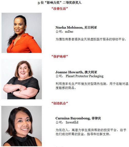 在此次“影响力奖”评选中,各类别的一、二、三等奖奖金分别为10万美元、6万美元和3万美元。此外,9位获奖者还将分别获得价值1万美元的创业培训。