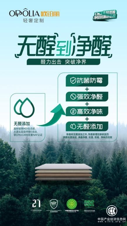 随着消费升级以及后疫情时代的来临,绿色、环保、健康成为大多年轻消费者选择产品和品牌的首要条件,具有净化甲醛功能的产品也愈发受到他们的喜爱,值得一提的是,近年来,欧铂丽凭借过硬的产品品质多次斩获环保相关奖项,始终屹立“家居健康”环保标兵之列。为了更好缔造健康居室,欧铂丽先后推出「无醛添加」舒芯板和第二代无醛添加「净醛抗菌」舒芯板。「无醛添加」舒芯板,精选实木原料,胶水的选择亦是严格筛选,选取多用于民生、航空、汽车、纺织等领域,获得NAF认证的MDI生态胶。不含任何甲醛成分,实现基材甲醛0添加,甲醛释放量≤0.03mg/m³,远优于国家E1级环保标准,并通过美国EPA+CARB-NAF无醛豁免检验,出口美国无需检测。