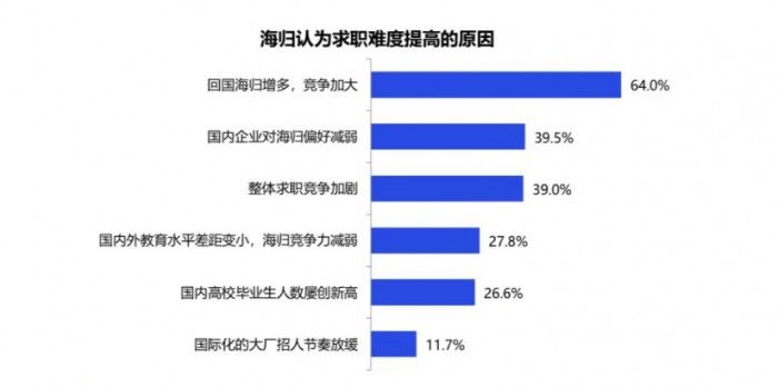 海归回国创业意愿进一步加强。智联报告显示,2022年回国求职的留学人才数量大幅度增长,留学生回国意愿增强。但随着国内高校毕业生质量提高,企业面向留学人才优先的职位数量持续走低,使得留学人才在国内的求职压力有所加大。2019年、2020年、2021年同比增幅分别为-25.4%、-23.5%和-0.4%。超八成的留学人才认为,国内求职难度较从前有所提高,其中占比最高的是“回国海归增多,竞争加大”“国内企业对海归偏好减弱”两大原因。