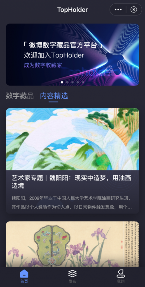 数字藏品功能上线后,微博用户可以在TopHolder申请成为数字藏品创作人,将发布到微博的原创作品进行数字内容登记与溯源上链,一站式实现社交化数字藏品的生成,并展示在微博的个人主页中。藏家用户则可通过创作者的个人微博主页查看其数字作品,并一键收藏心仪之作。
