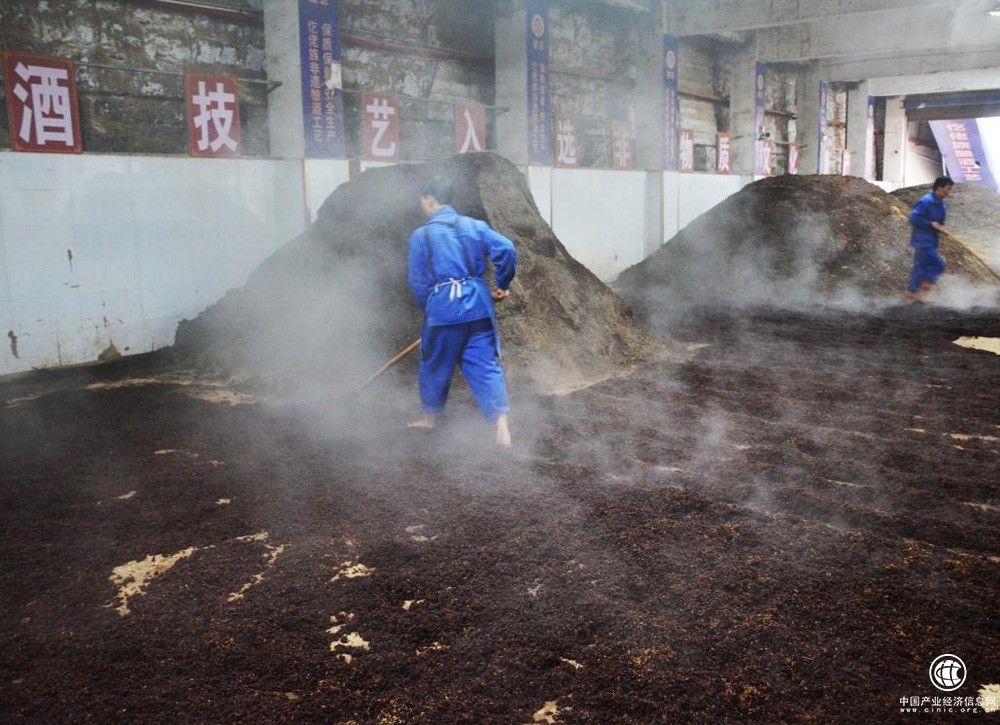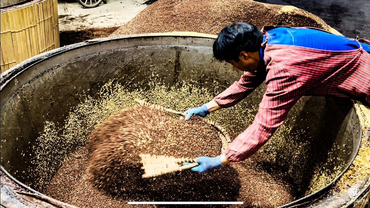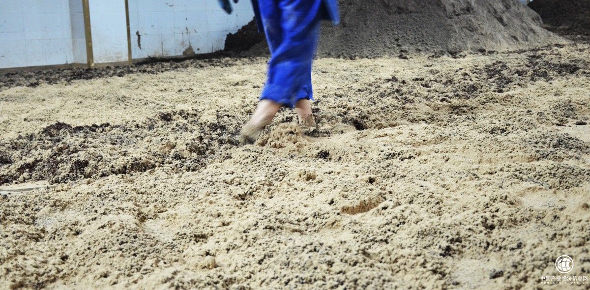 晾堂上,糟醅正散发着蒸汽,酿酒师开始将其摊晾制细。为了防止糟醅粘连结成块,糟醅摊匀后要及时拉细扫松散,翻铲成行,保证摊晾后的糟醅不成团。取酒后的糟醅,又经过人工摊晾,在充分降温的同时,“网罗”空气中有益的微生物,以便后续深入发酵。