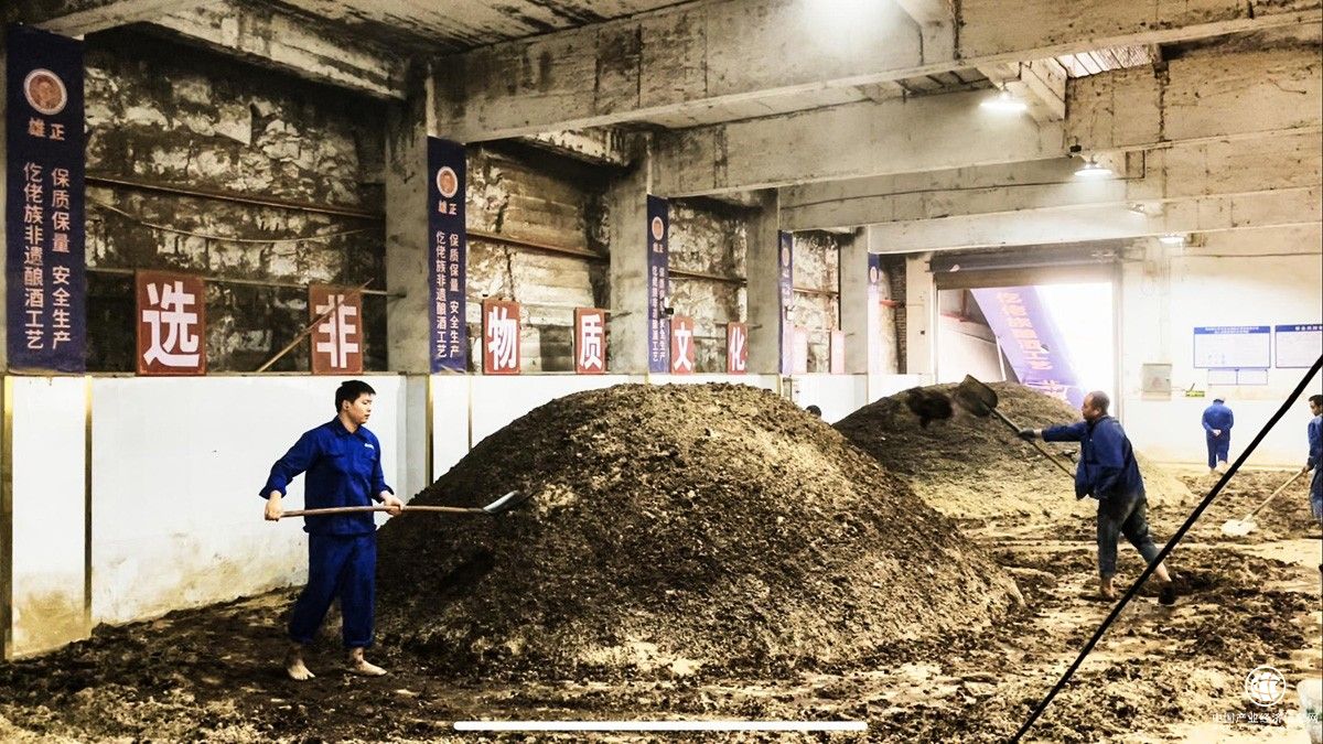 拌曲之后便是堆积发酵以及入窖发酵。第一轮次糟醅取完酒后,将入窖发酵20多天,在清明节进行第二轮次烤酒,如此循环往复,共经历九次蒸煮、八次发酵、七次取酒。每轮次酒将分批贮存,待七轮次取完后,根据各轮次酒质情况,第一年进行大渗合(盘勾),使其初具风格、风味,然后装入大溶器中,在自然的太阳光下日晒雨淋一年,然后再抽回到库房地窖中用陶坛贮存 5 年以上。等待醇化和酒体完全老熟后,再根据产品质量标准、口感、香气进行微调成品。所以一杯酱香四溢的酱香酒,实属大自然、宇宙、时间等各方能量的美好馈赠。