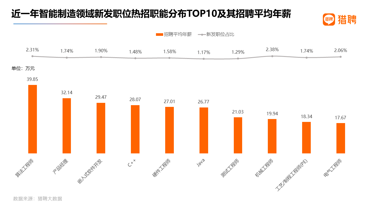从智能制造领域热招职能TOP10来看,机械工程师新发职位占比最多,为2.38%;算法工程师紧随其后,占比为2.31%。位居第三的是电气工程师,新发职位占比为2.06%,其他职能新发职位占比均小于2%。从这十个热招职能对应的招聘平均年薪来看,算法工程师最高,为39.85万元;位居第二、第三的是产品经理、嵌入式软件开发,为32.14万元、29.47万元;机械工程师薪资排名第八,为19.94万元。