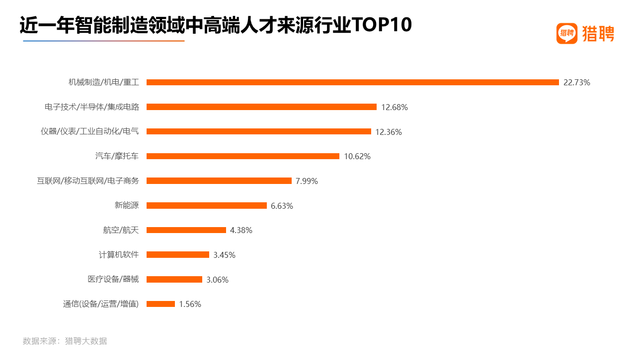 从近一年来智能制造领域中高端人才来源来看,机械制造/机电/重工成为第一大人才输出行业,其占比为22.73%,遥遥领先。电子技术/半导体/集成电路、仪器/仪表/工业自动化/电气、汽车/摩托车位居第二至第四,占比分别为12.68%、12.36%、10.62%。