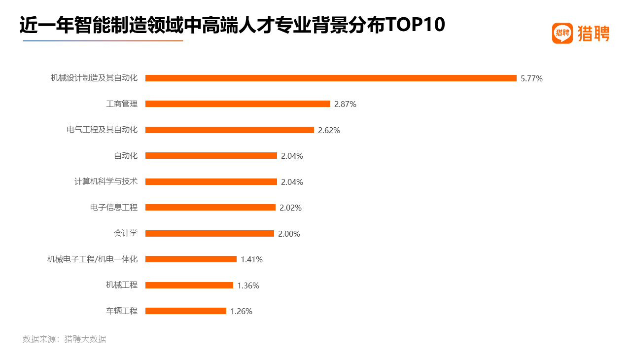 总体而言,智能制造领域的人才专业出身比较多元化,在专业占比排名前十中,以理工科居多。近一年智能制造人才专业背景排名第一的是机械设计制造及其自动化,占比为5.77%;排名第二、第三的分别是工商管理、电气工程及其自动化,占比为2.87%,2.62%;并列第四的专业是自动化与计算机科学技术,占比均为2.04%;排名第六、第七的是电子信息工程、会计学,占比分别为2.02%、2%。其他专业的占比均低于2%。