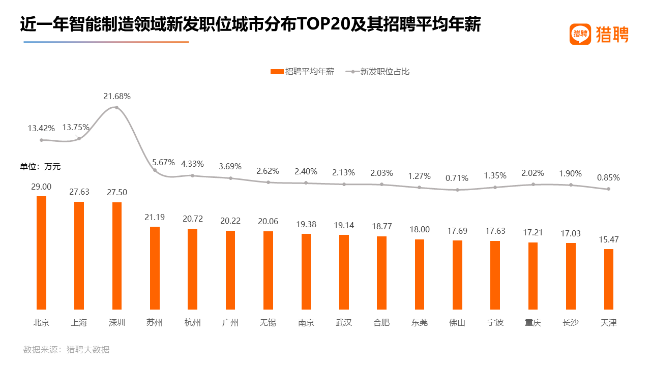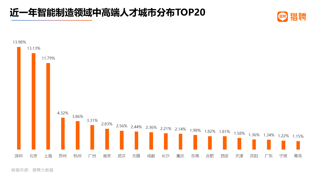 深圳是既是一线城市,又有互联网大厂总部,也有多个智能制造、无人机等新型制造公司,因而深圳作为头部第一的智能制造人才所在地,毫无悬念。