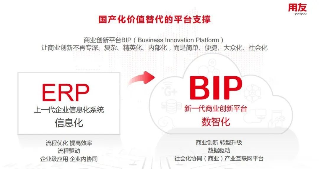 今天,企业数智化转型的底层逻辑是实现业务和管理的重构与创新。国产化价值替代的平台支撑也已经从上一代流程驱动的企业信息化系统ERP,向数智化时代,数据驱动的新一代商业创新平台BIP转型。