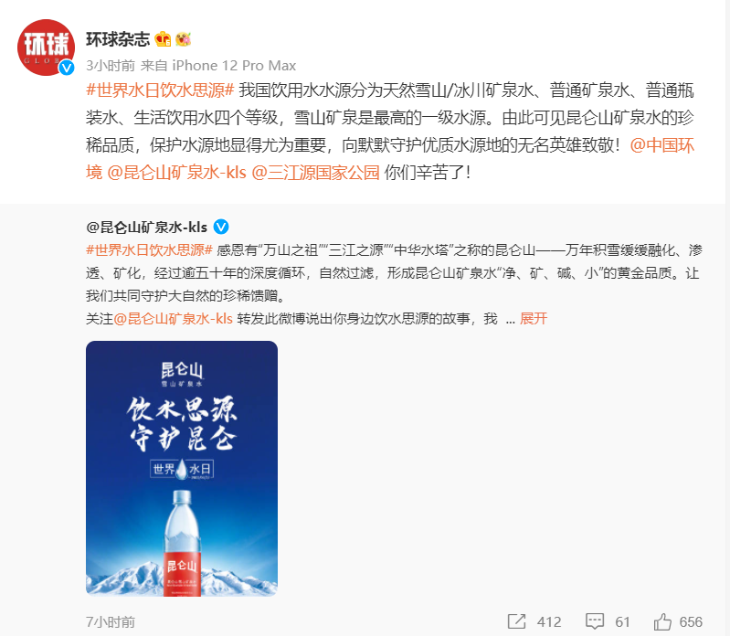 今年3月22日是第30个世界水日,作为中国高端矿泉水的开创者和领导品牌,昆仑山矿泉水发起的#世界水日饮水思源#话题引发互联网热议,其中不乏媒体和网友对于昆仑山矿泉水点赞之声:不仅率先打造了中国人自己的高端矿泉水品牌,助力饮用水消费升级,更是在守护“中华水塔”“三江之源”上默默贡献着力量。
