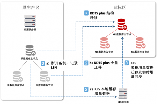 阶段一:结合柔性迁移过程,在解决存量数据迁移及增量数据同步后,保持KFS从原系统数据库到KES的链路畅通。此时系统运行仍基于原数据库。
