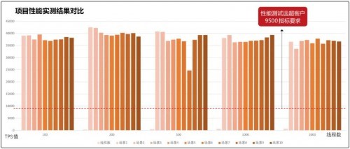 金仓项目负责人介绍,客户原营销系统的存量数据近2TB,超百亿条;业务量日均超千万,峰值可达2000万,未来预计将翻3倍。系统建成后需保证9500以上的TPS指标要求,同时需保证业务处理整体响应时间不超3秒。考虑到未来近三倍的业务压力提升,用户选择通用高性能x86服务器作为验证平台,并选取10个典型业务场景,在不同的数据库并发连接压力下进行严格的性能指标测试。经测,金仓数据库在各测试中TPS平均值超38000,最高超42000,最低也有24000,比期望值平均高出3倍,远超指标要求。