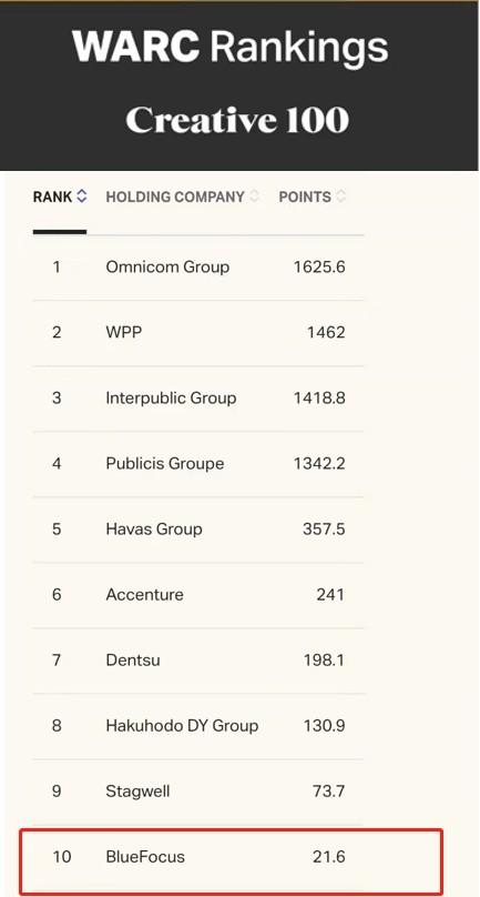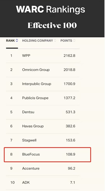 近日,全球权威广告营销行业咨询机构WARC发布了2022年度实效百强榜(Effective 100),蓝色光标入选“全球最佳控股公司”TOP10,位列第8名,较去年再进一位。蓝色光标连续七年跻身WARC“全球最佳控股公司”TOP10榜单,是唯一进入全球前十的中国营销公司。