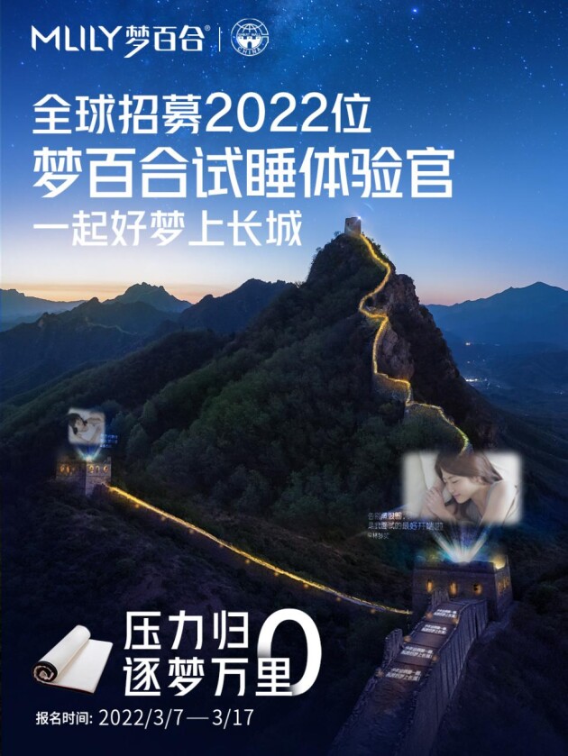 Mlily梦百合在近日开启的第六季321全民试睡节中,以全新的方式将品牌营销活动做到万里长城。通过创意的互动形式,引发国民对睡眠问题的思考,诠释0压睡眠理念,为国人筑起一道“0压睡眠长城”,在倡导对0压健康生活的同时,梦百合也承载起一份民族企业的社会责任。