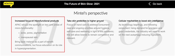 去年,长期提供跨国市场研究咨询的老牌智库Mintel(英敏特)发布全球护肤行业报告,特别指出深入细胞层面、着重针对色素沉着问题的产品将成为新趋势——Vida Glow滤镜胶囊的第一个优势正好符合这一趋势,可以直接作用于细胞层面解决色斑和肤色问题。