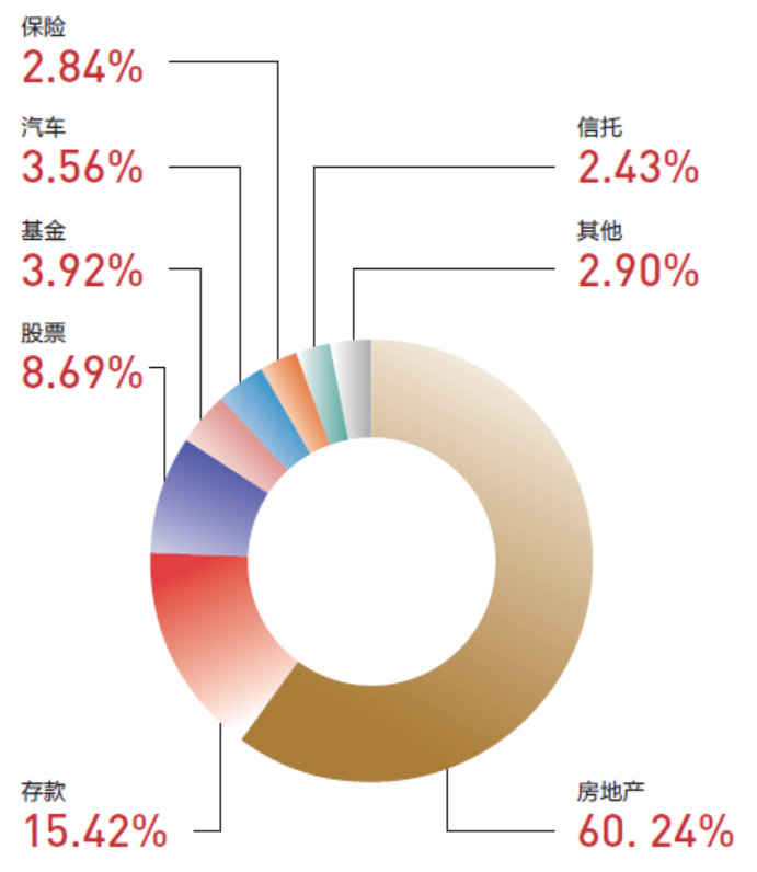 据《白皮书》统计,目前我国居民家庭资产配置主要以房产为主,占比为60.24%。