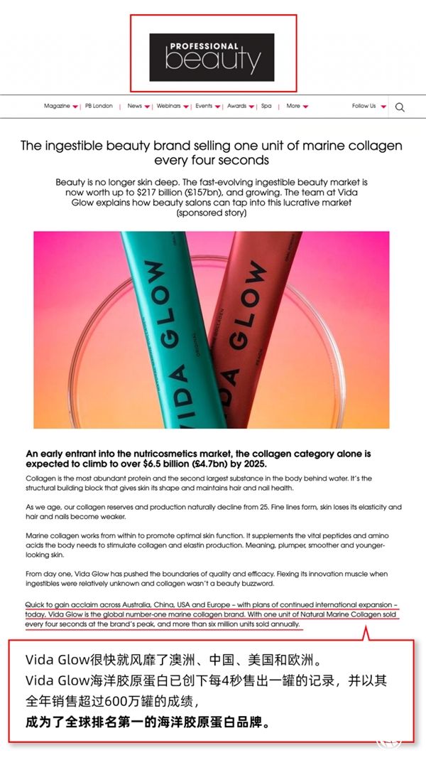2020年Vida Glow品牌狂欢节期间,经典明星爆品海洋胶原蛋白粉曾创造出全球每4秒售出一罐的销售奇迹,成为50多个国家最受欢迎的胶原蛋白品牌;2021年,英国美妆业顶级垂直媒体《Professional Beauty》发布专题,认证Vida Glow海洋胶原蛋白粉是“全球排名第一海洋胶原蛋白”,让Vida Glow成为了当之无愧的全球口服美容领先品牌。