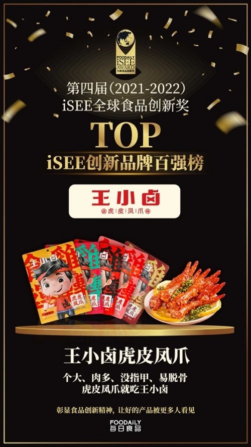 近日,2021-2022iSEE全球食品创新百强重磅发布,王小卤虎皮凤爪凭借“个大、肉多、没指甲、易脱骨”4大特性,以及广大消费者的深厚青睐,从近500家企业的角逐中脱颖而出,斩获食品类百强。